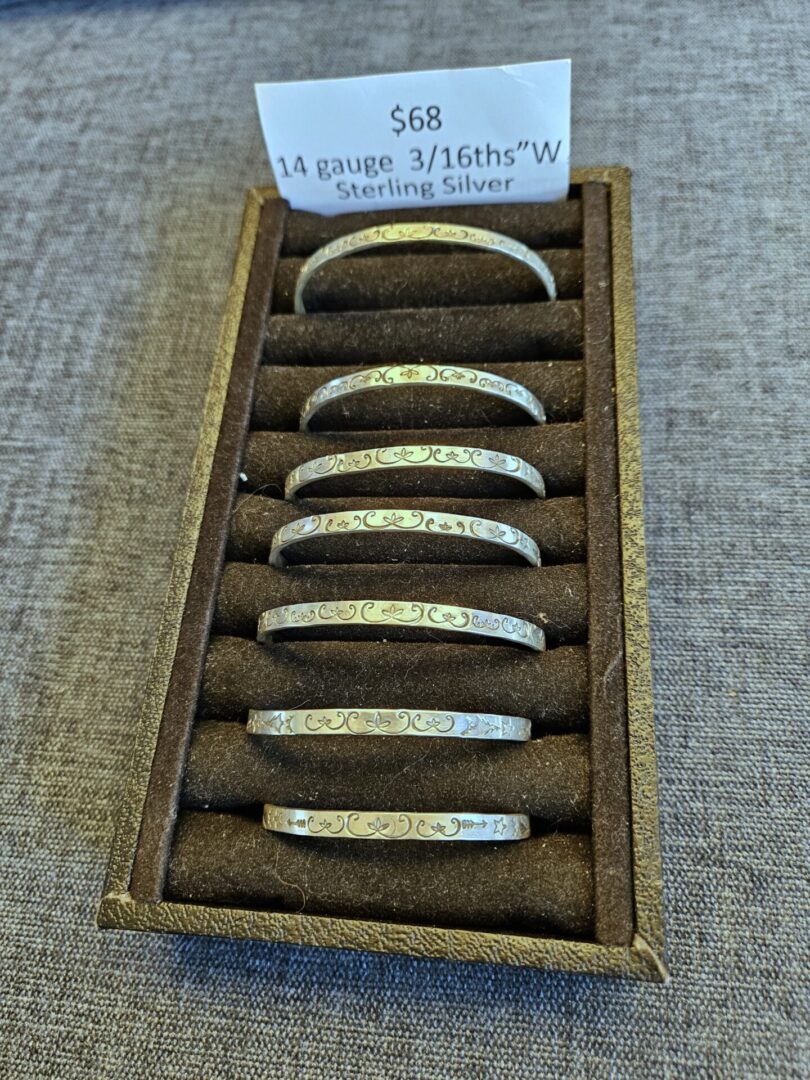 Paul René has made a set of sterling silver cuffs in various sizes. They are 3/16th wide and this cuff is size 6.2.