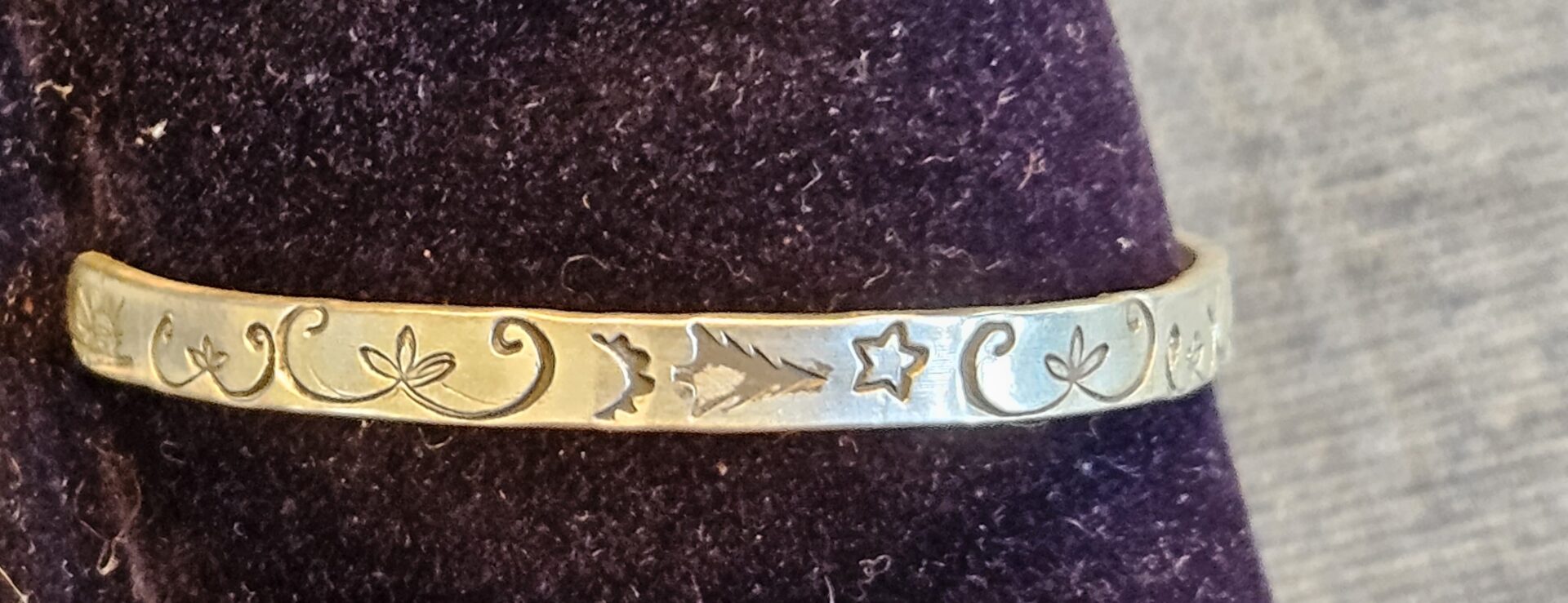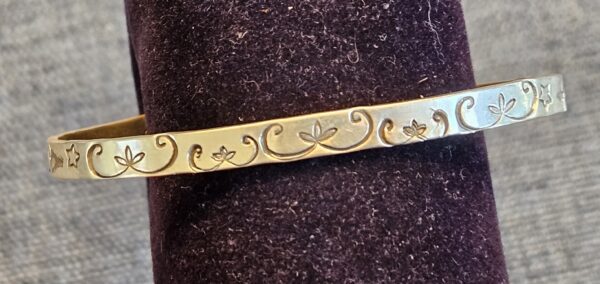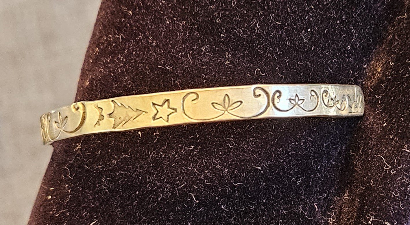 This sterling silver cuff has a double curve fiddleheads and other Wôbanaki designs – with plants for Mide healing.  Similar to other cuffs listed but each is different. Signed with the Sunrise Drum ™ hallmark and stamped sterling.  Fourteen (14) gauge sterling silver in Eastern Woodland Wôbanaki style.   Completely hammer hardened and the gap can be slightly adjusted through careful pressure forming to a person’s wrist due to it having some spring flexibility. Adjustments should be infrequent.  It easily and comfortably fits medium and some smaller wrists. This is a style for those who want the traditional Eastern Woodland double curve design for new growth and new life.  Curves represent the fiddleheads and young plants of spring with the new life energy found in this spring season. The trees represent people, families, communities and Nations, placed inside the double curves they become energized with new life.  Stars and moons remind us of our ancestral relations and with the curves become a prayer for renewal and healing for ourselves and our languages and cultures here in North America – Turtle Island (‘Tolba Menahan’ in Western Abenaki).  Each is a little different.