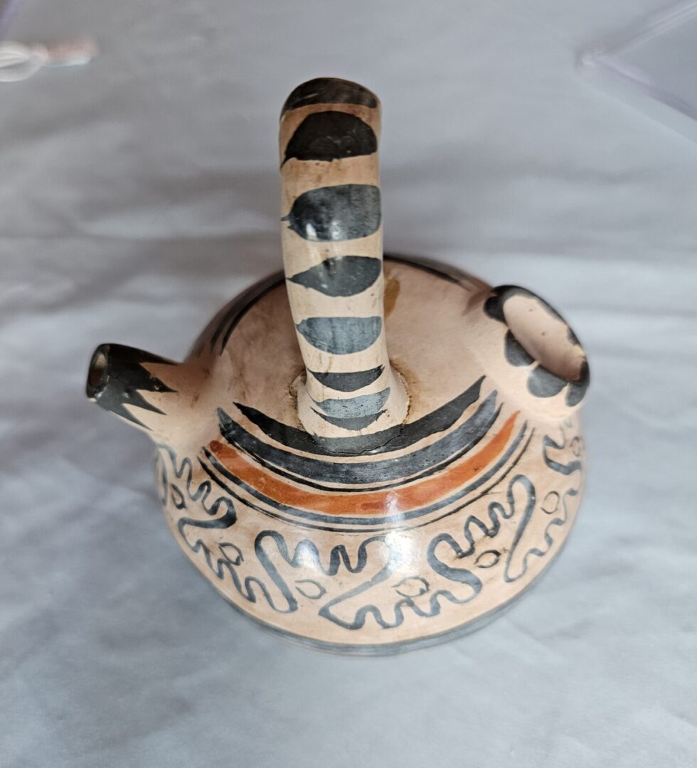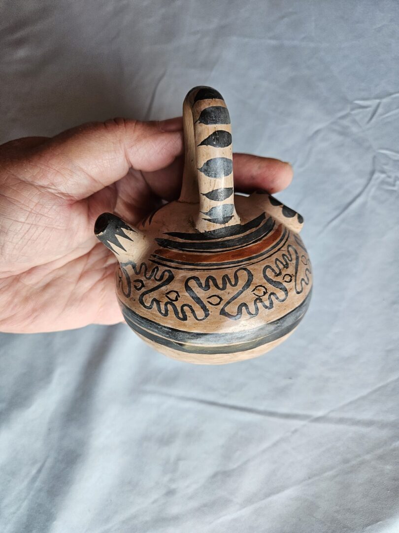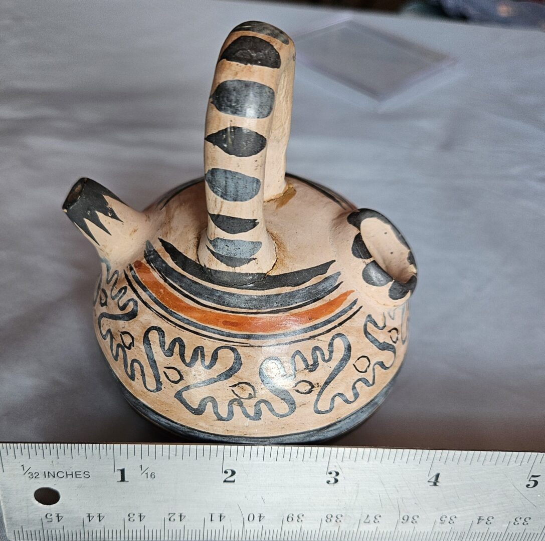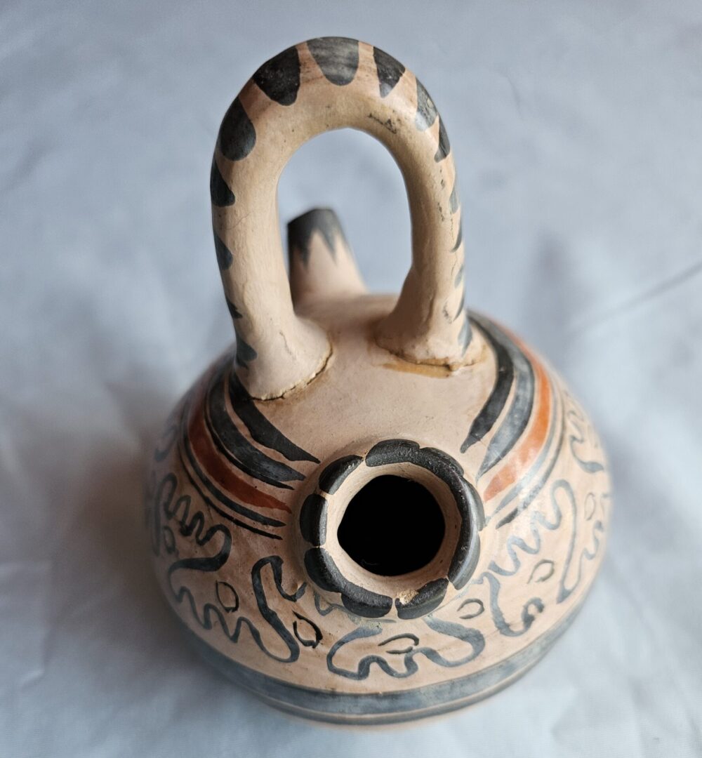 Old antique pottery 4inch pot. We think it is from one of the Southwestern pueblo communities but do not know which one or if it could have a different origin. We hope someone who knows and collects this type of art will find and love it! It is so nice. It came to us as part of an old collection with many items not identified. the pot is unsigned. The handle appears to have been reglued on some time in the distant past – our guess mid 1900s as it looks like the seam has aged yellow – so again gives an antique feel to this piece. The overall appearance presents as crisp and clean original antique pottery item. The repair does not, in our opinion, change the beauty and uniqueness of this piece. Deserves a good home. Please examine photos for more details.